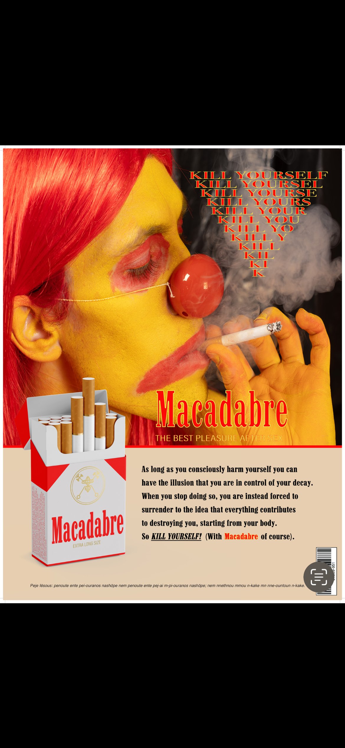 like a vise between boredom and dissatisfaction. Within the magazine, there are also “easter eggs” and hidden meanings which the author has inserted with the intent of sparking curiosity and inviting the reader to explore and discover beneath the surface of the images. Closing the magazine is a parody of a vintage cigarette advertisement that ironically puts into focus the death drive and the tendency toward self-destruction. The entire project is dedicated and in memory of